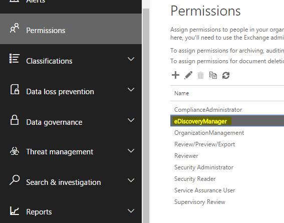To add the permissions go the Permissions Tab on the same portal, and add your admin account into eDiscoveryManager Role Group.